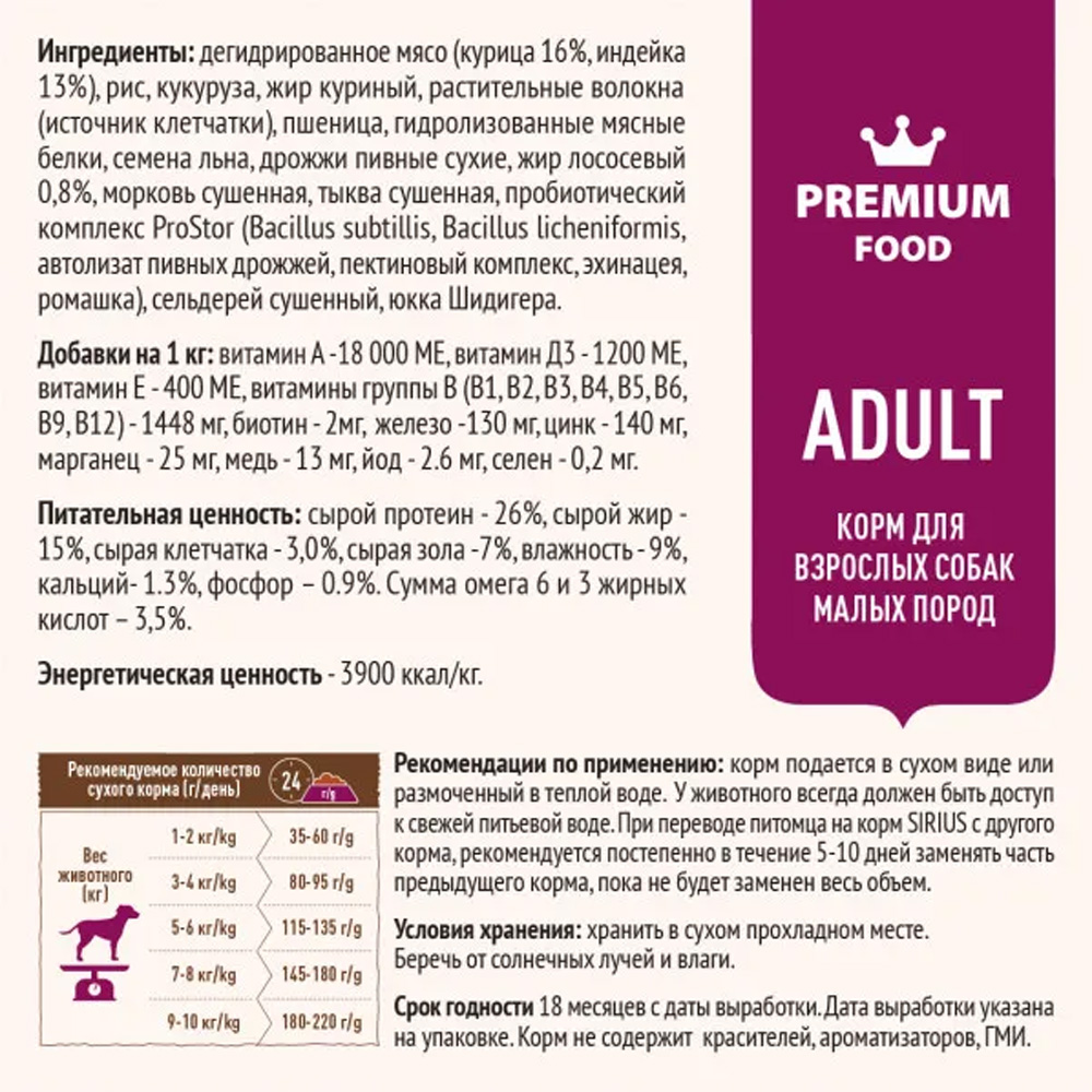 Sirius сухой корм для взрослых собак малых пород с индейкой и рисом - 2кг